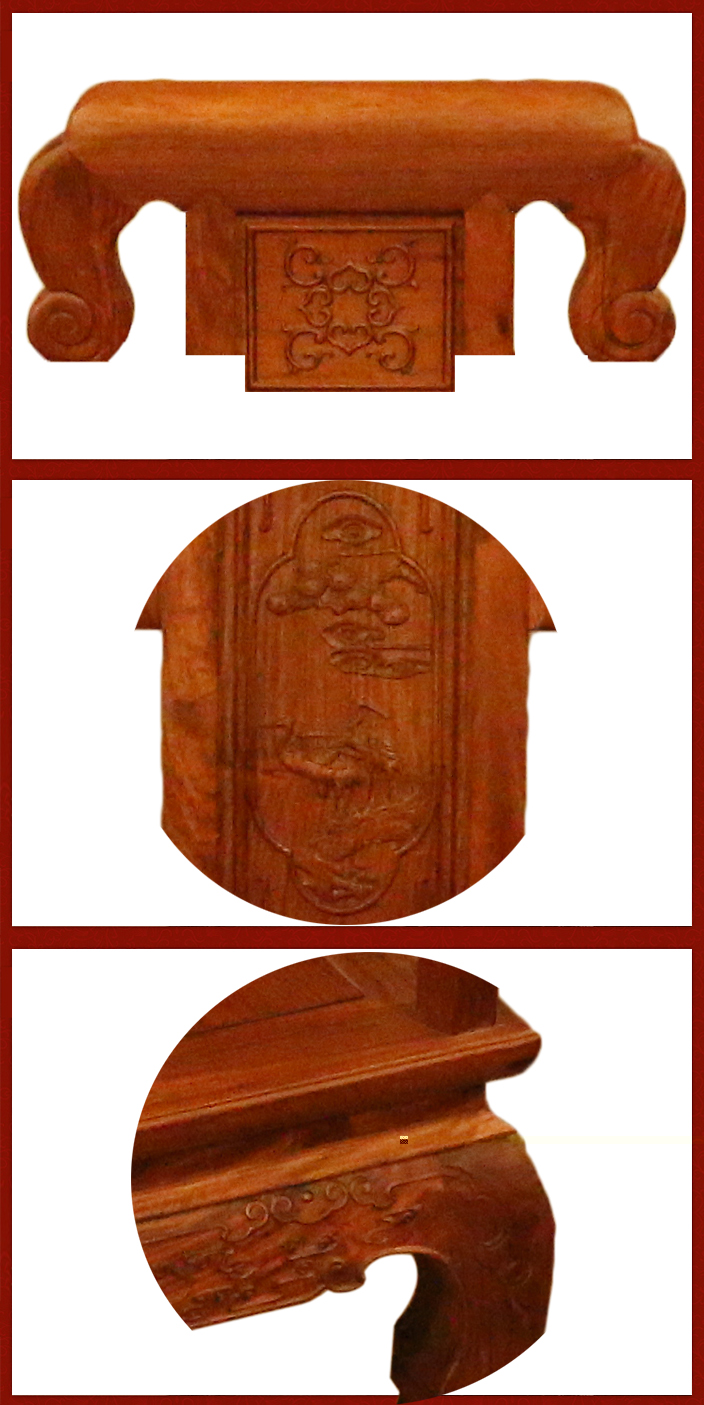 之后,是餐椅的主架骨,坐板以及四腳處,餐椅坐板平整圓潤(rùn),四處椅腳處亦呈圓滑之態(tài)向下順勢(shì)延伸,頗顯自然流和,餐椅正左右三面各有三條支板木架相接,使之更加穩(wěn)固,椅腳各處亦有多處祥云絲邊鑲嵌裝飾之上,整體裝飾上也愈更顯得和諧工整美觀。