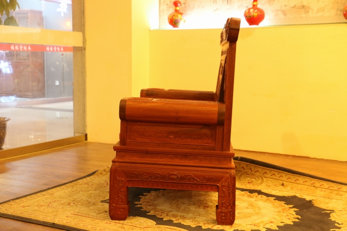 該款沙發整體之表現顯得極為嚴密厚實,無一處鏤空之雕飾,在最上端背板處的中間部分為留有一些花紋之邊幅加以修飾,顯得極為浮美雅觀。而在其左右兩側則另雕繪有“麒麟戲珠”與“雛鳥朝鳳”兩處紋飾圖案:“麒麟戲珠”紋飾設計地較為特別,如草龍紋一般,除頭部精細雕刻外,其余四肢與形體均簡略化,身體部位采用一銜邊條帶狀的紋飾相串于圓珠內,頗顯靈動神韻;而“雛鳥朝鳳”的圖案則是在背板最上部的左右兩端,末端是饒有一圓弧之設計為修飾收尾,顯得極為婉轉柔和圓潤。紋飾的圖案為一只可愛的雛鳥深情脈脈含情注視著前方鳥鳳的場景,顯得實為溫馨。鳳凰處之設計處理地也與前面麒麟一同:頭部細化,其余簡略帶過,鳳凰處眼眸之雕飾顯得極為醒目,神情表現形態逼真,層次感和手觸感亦十分明瀝彰顯,而經燙蠟處理的表面緬花材質表現地也更為細膩淡雅,極盡奢華。