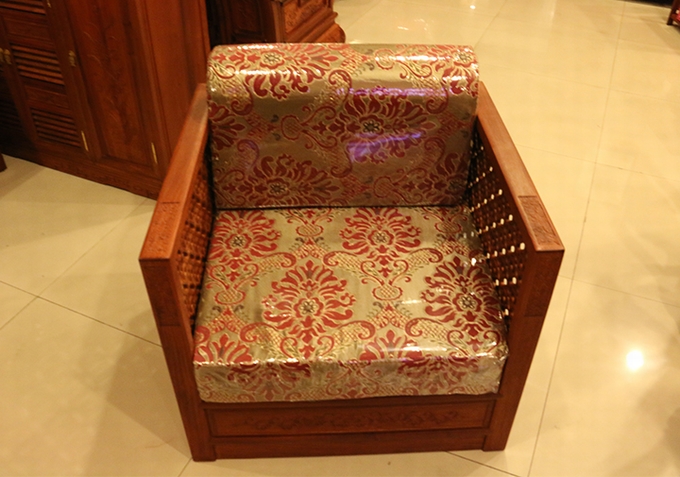 單人座沙發(fā)外觀方正匡整,兩邊扶手的高度設(shè)計(jì)的與靠背同高,而在其內(nèi)外兩側(cè)均雕繪有幅闌的鏤空幾何紋飾作為點(diǎn)綴,彰顯著浮美淡雅的中國風(fēng)式含蓄美。在沙發(fā)實(shí)際使用時(shí),配上軟墊之后的坐感也更覺舒適,沙發(fā)座腳處地設(shè)計(jì)顯得地較為獨(dú)特,也可以說它已經(jīng)將座腳處設(shè)計(jì)的概念完全融入了沙發(fā)整體,以之整體式的箱體結(jié)構(gòu)作為座腳,更覺敦實(shí)、小巧玲瓏,頗有些許歐派家具式風(fēng)格的韻味,實(shí)為別致。