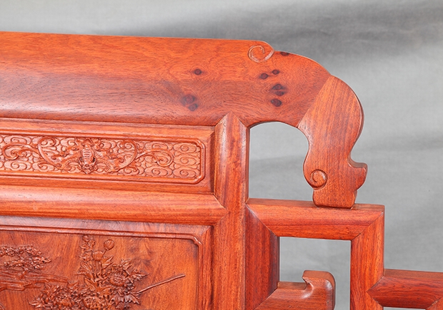 整體上,該款沙發(fā)背板處的設(shè)計(jì)有別于我們福林堂紅木客廳沙發(fā)系列里面的其他沙發(fā),所留余鏤空面積較多,主要位于正中背板處的左右兩側(cè)的上下各處部位,鏤空形狀匡正簡致,整齊有一,左右對稱,極具觀賞美。另在其鏤空的中間位置處,還特別雕繪有一精美的草龍紋飾。