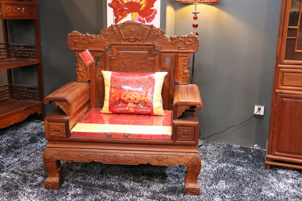 再往上,扶手處下端的前方位置均還外設(shè)有一小框格之抽屜,方便亦實用;而框格的上方則是兩處設(shè)計為鏤空式的長框格扶手,扶手左右的末端均以卷曲收尾,秀氣端莊圓潤舒適,而鏤空內(nèi)則是以兩顆壽桃作為承托雕刻,形象意寓生動。另在實用性方面,該系列的沙發(fā)也借鑒了現(xiàn)代沙發(fā)座椅中軟綿舒適的使用特點,在座面上以及靠背板處還添備有一席軟墊以及靠背枕作為置換,根據(jù)環(huán)境需要以及個人使用習(xí)慣特點進行選擇性添置或撤換,十分方便。