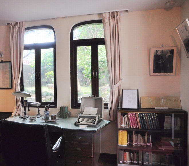 “我要一個好書齋,一個好煙斗。”這是林語堂40歲時的理想。他的書房中鋪著紅色的地毯,擺著黑色的沙發,墻壁上是他與張大千、錢穆的合照,兩面墻壁前是寬大的書柜,保存著他的4000多種藏書。門口處就是一張他親自設計的寫字臺,臺子的前面凹進去一塊弧形,使他略顯肥胖的身軀在寫作的時候更加舒適一些。他在書桌前的經典姿態是,腳踏著半開的抽屜,一手拿書,一手持煙斗。